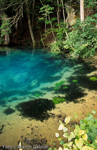 Der Blautopf gehört zu den typischen geologischen Erscheinungen des Jura. Der unter Naturschutz stehende Quelltopf des Weihermühlenbaches wird mit Hilfe eines Wehres gestaut. Das Karstwasser hat ganzjährig eine Temperatur von 8 °C und nahezu Trinkwasserqualität. Sein Name stammt von der bläulichen Farbe des Quellwassers. Das Wasser ist aufgrund des Dolomitanteils im unterirdischen Höhlensand magnesiumhaltig. Im Wasser leben Forellen. Aus unerklärlichen Gründen versiegte der Blautopf im Jahre 1692 kurzzeitig. Die Bewohner errichteten aus Dankbarkeit, als sie wieder sprudelte, eine kleine Votivkapelle (Weihermühlkapelle), die noch vorhanden ist und unterhalten wird.