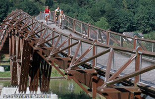 Die ungewöhnliche Hängebrückenkonstruktion ist eine der längsten Holzbrücken Europas und überspannt den Main-Donau-Kanal. Hängebrücken haben Tradition in dieser Landschaft. Zur Römerzeit spannte sich eine große Seilhängebrücke über den Donaudurchbruch bei Weltenburg. Abgeleitet vom uralten Prinzip der freihängenden Seilbrücke spannt sich ein Zugband aus 9 brettschicht-verleimten Holzbalken über drei Pfeilerböcke zu den Brückenköpfen. Über dieses einer Seilzuglinie folgende Zugband werden die Brückenlasten zu 90 % in Form von Zugkräften abgetragen. Daraus resultiert der äußerst schlanke, nur 65 cm hohe Querschnitt. Die Gesamtlänge der Brücke beträgt 193 Meter.